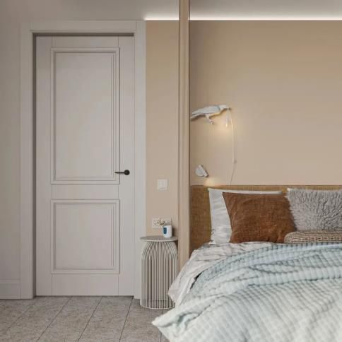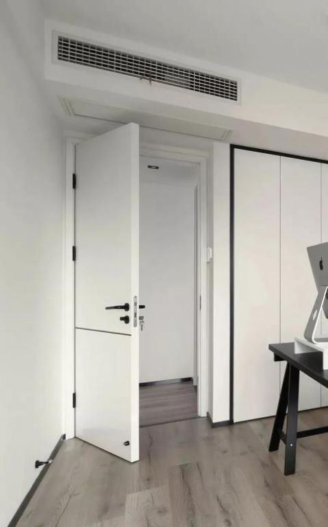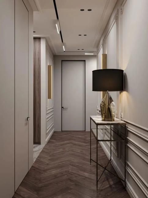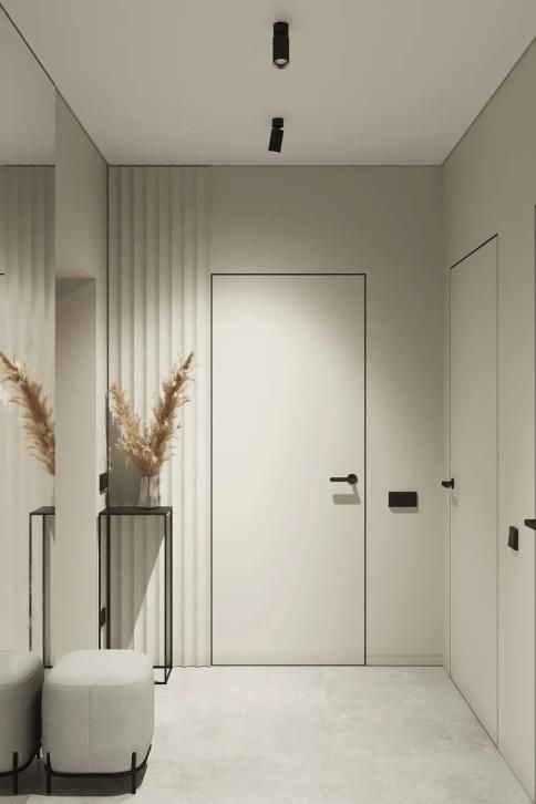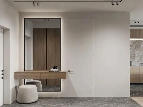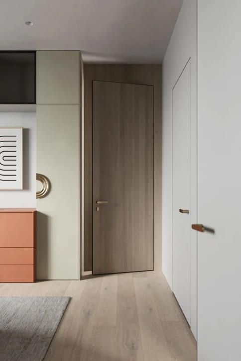 從色彩和風(fēng)格起程進行匹配,選取和墻面相近的色彩并且沒有裝潢的平坦門套,門套隱形于墻體之中,融為一體,能夠起到衍生空間的功效。