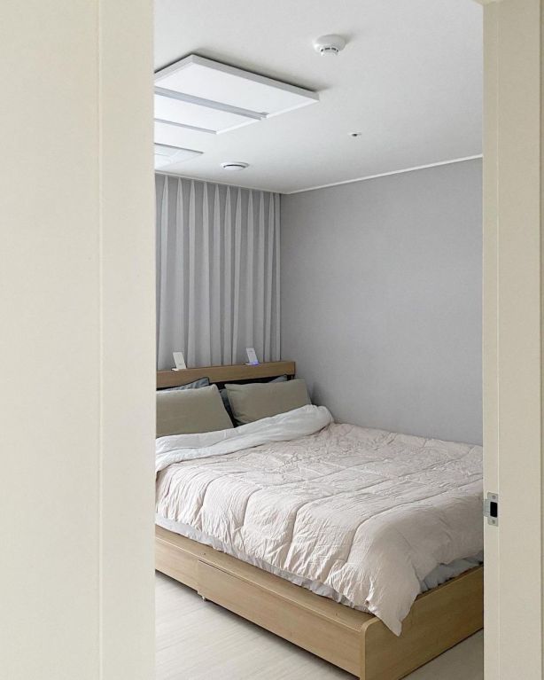 主臥空間適合大人居住,還是喜歡這種簡單舒適的布局。灰色的墻面搭配灰色的窗簾。木質床鋪配上棉質床單,看起來非常干凈。難怪別人都說再過10年也是流行。