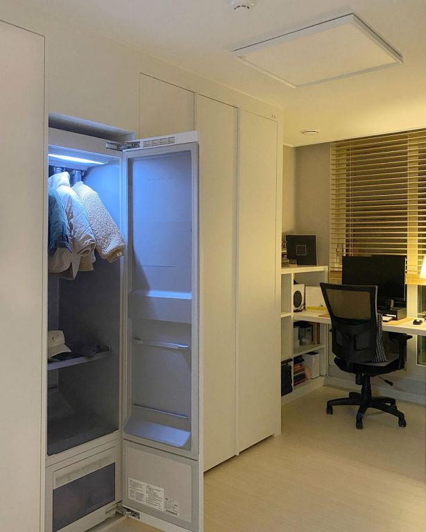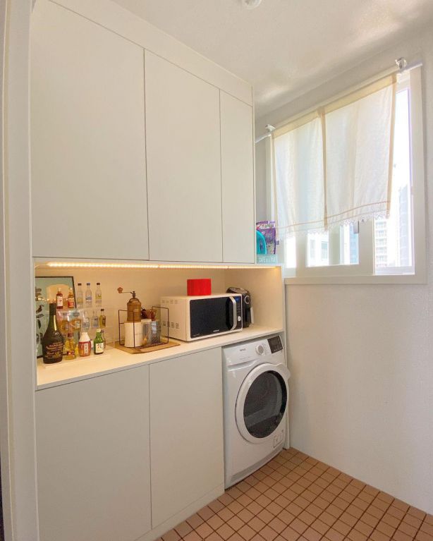 陽臺空間被改成了洗衣房使用,利用側邊打造到頂的柜體,可以嵌入洗衣機、烘干機等物品。吊柜側邊留空一部分,還可以把洗衣液通通塞進去。