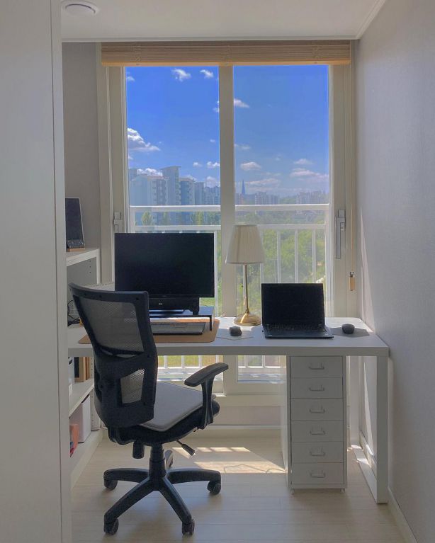 書房空間其實很小,所以選擇和衣帽間結合。靠窗不到2㎡的一小部分空間放置書桌和柜體,平時大人可以在這里辦公,白天享受最好的光線和最美的窗外風景,完善拉上百褶窗,又能給予自己靜謐且隱私的空間。