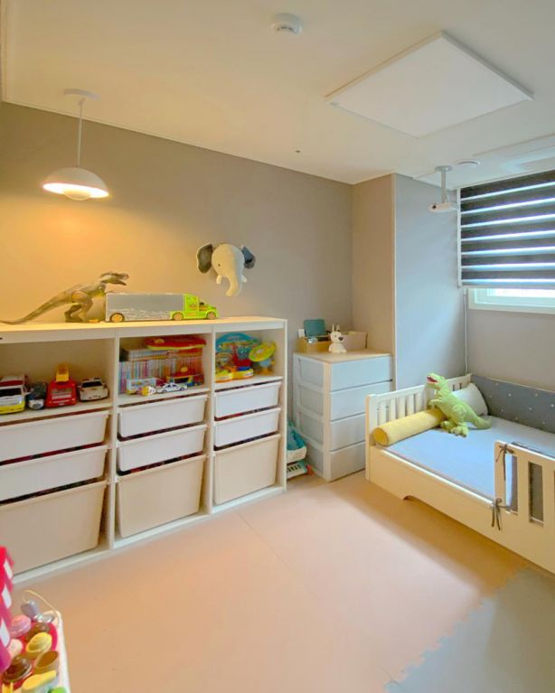 目前孩子還小,所以只在拐角安排一個超小的迷你床,足夠孩子一個人使用了。其他空間拿牌柜體存放孩子的書籍和玩具,給孩子更多的活動空間。