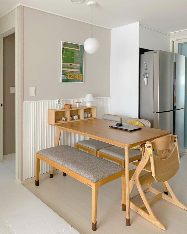 餐廳布局你們可以學習,乍一看沒有什么復雜的,但是實用性藏在小細節里。比如餐桌邊墻面下方鋪貼護墻,防濺油防濺水,有效保護墻面。餐桌上方還擺放了一個開放式的置物架,可以存放一些小雜物,拿取方便。