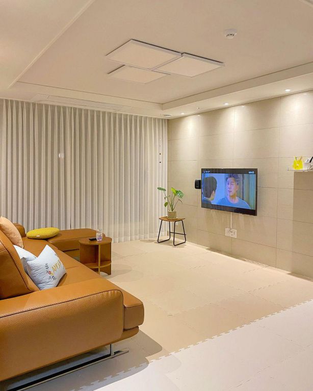 客廳空間比較簡單,沒有多少物品,只有簡單的電視、沙發和茶幾布局,東西越少反而顯得更加精致。深橘色沙發和暖色系的瓷磚搭配,又復古又干凈。摒棄滿墻柜體,掛放電視,并給旁邊墻面安排一個置物架就搞定。