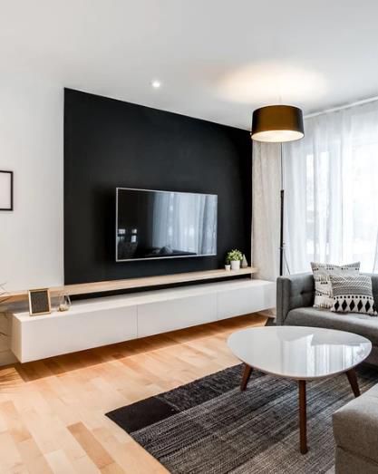 如果您想跳過墻板,同時仍然幫助您的電視“融入”空間,那么涂漆的黑色裝飾墻是一個不錯的選擇。雖然您不會得到任何帶有榫槽鑲板或黑色木板條墻鑲板的紋理,但您將獲得干凈、簡約的外觀和強烈的對比。