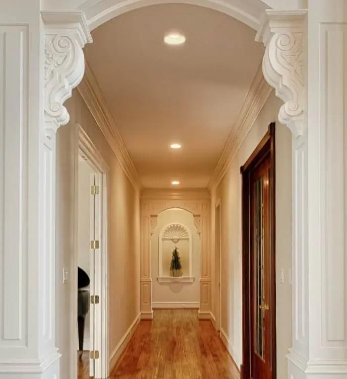 一個使用凸起鑲板的例子是在這些門口,在一個更正式的家中。鑲板一直延伸到天花板,內(nèi)上角有牛腿,看起來更加正式