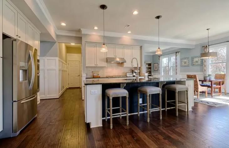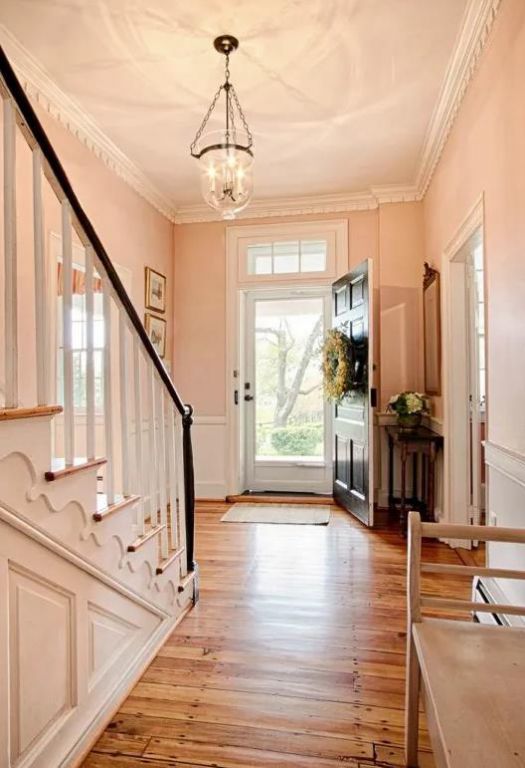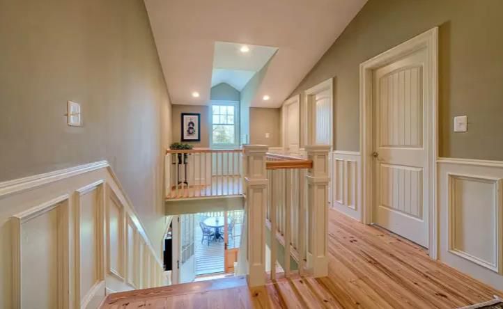 另一個凸起的面板護墻板的例子正在翻新的農(nóng)舍的樓梯一側(cè)使用。這張照片顯示,您可以在農(nóng)舍中使用正式的凸起面板樣式,以獲得休閑優(yōu)雅。順便說一句,你不喜歡那個 3 燈吊墜嗎?對于門廳來說,這是一盞很棒的燈