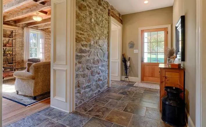 相框造型在門框內(nèi)部也很漂亮,讓入口通道看起來更正式。我喜歡石墻、外露橫梁、石板地板和木質(zhì)入口門的造型。