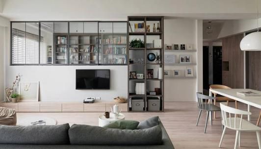 簡(jiǎn)約的電視柜搭配獨(dú)特的書架。客廳看起來(lái)既寬敞又通風(fēng),簡(jiǎn)單而整潔的電視架和透明的鋼化玻璃可以捕捉到所有的自然光。