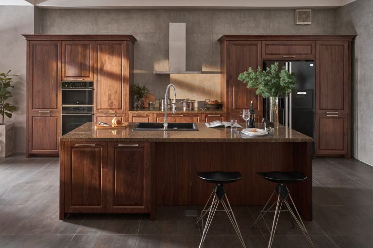 深色木紋的天然實(shí)木廚柜適用于明亮的廚房。無論風(fēng)格是現(xiàn)代還是經(jīng)典,深色木質(zhì)廚房都是永恒的選擇,將為您的廚房帶來一定的優(yōu)雅。深色廚柜看起來時(shí)尚、神秘和高檔。