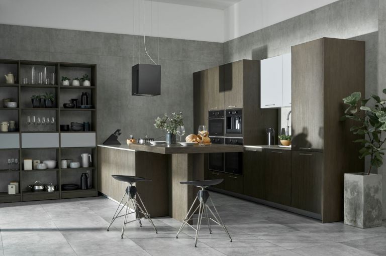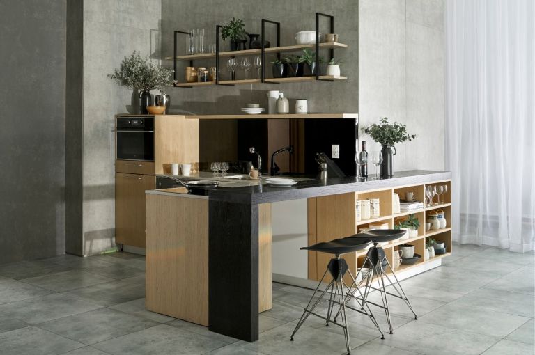灰色天然木廚柜搭配獨(dú)特的木紋線條,為室內(nèi)裝飾帶來時(shí)尚時(shí)尚的美感。與石材、同色混凝土、綠樹等原材料相結(jié)合,為廚房空間營造出詩意的靜謐效果。